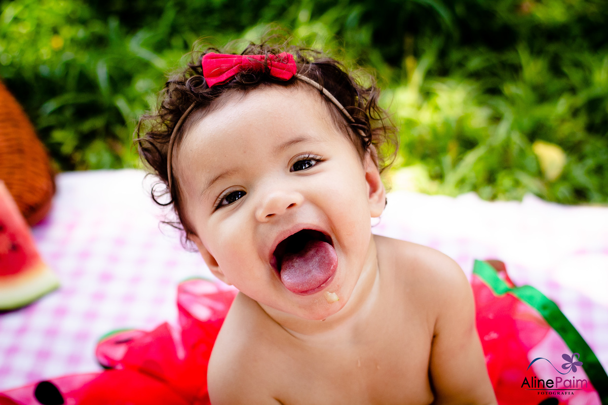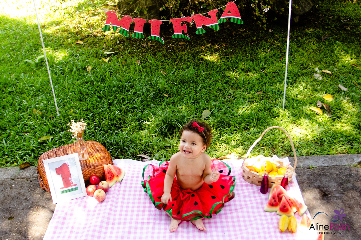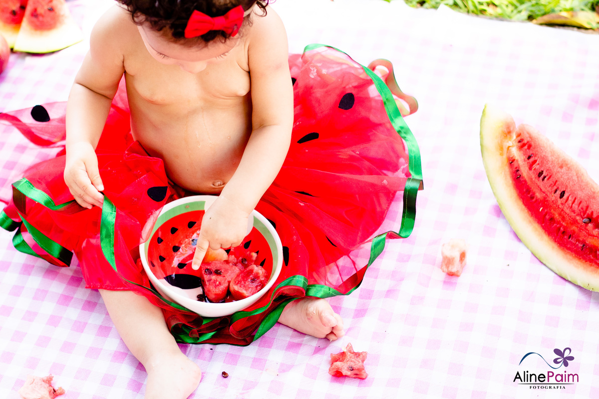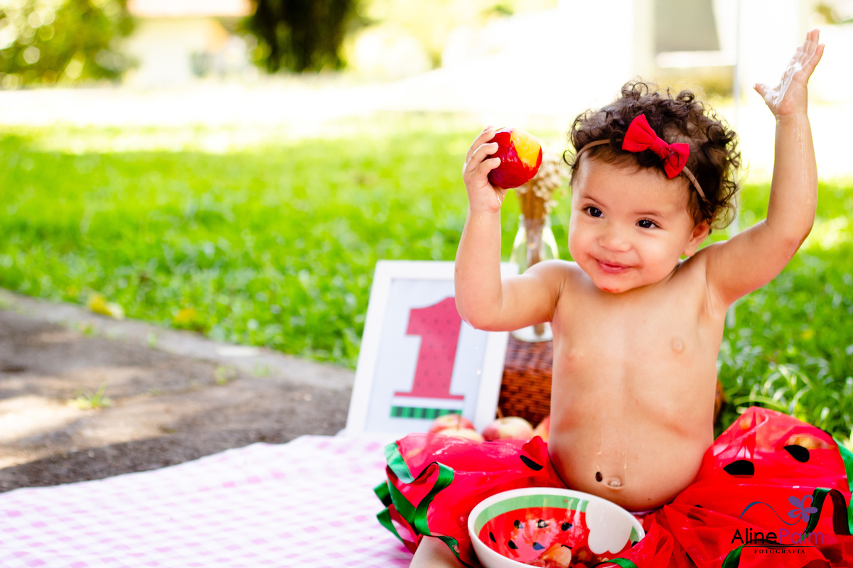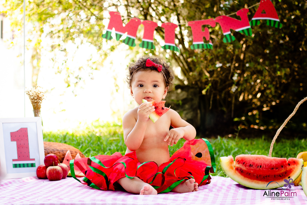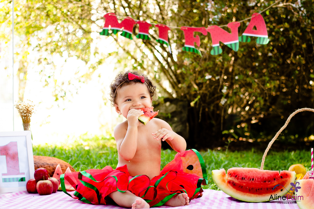 Para comemorar seu primeiro ano, fizemos este ensaio tão lindo aqui em São Bento do Sul, com muita melância e outras frutinhas que ela ama! Sem dúvida ela se divertiu e comeu muito :p