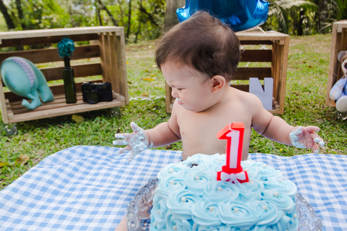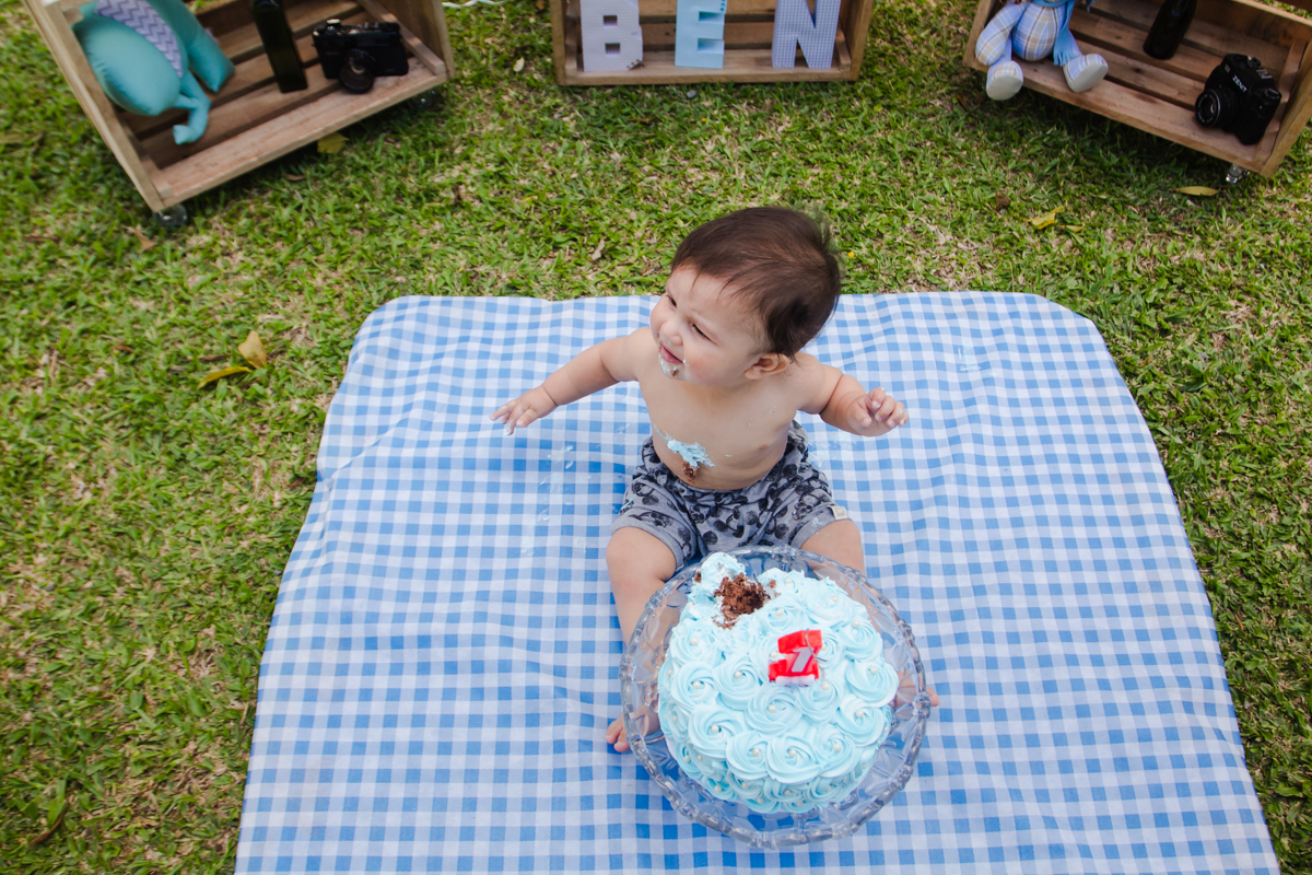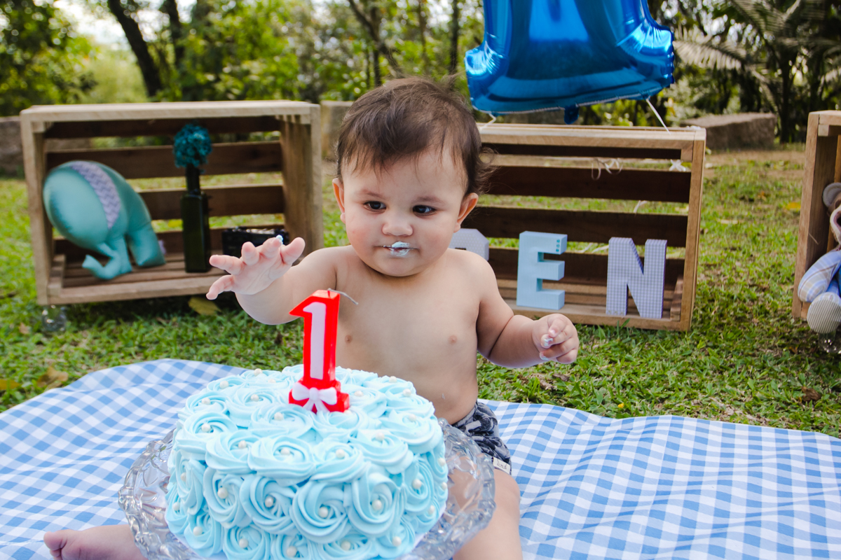 Para marcar essa data fizemos o Ensaio Smash The Cake, mas o Ben não curtiu muito a ideia de mexer no bolo.